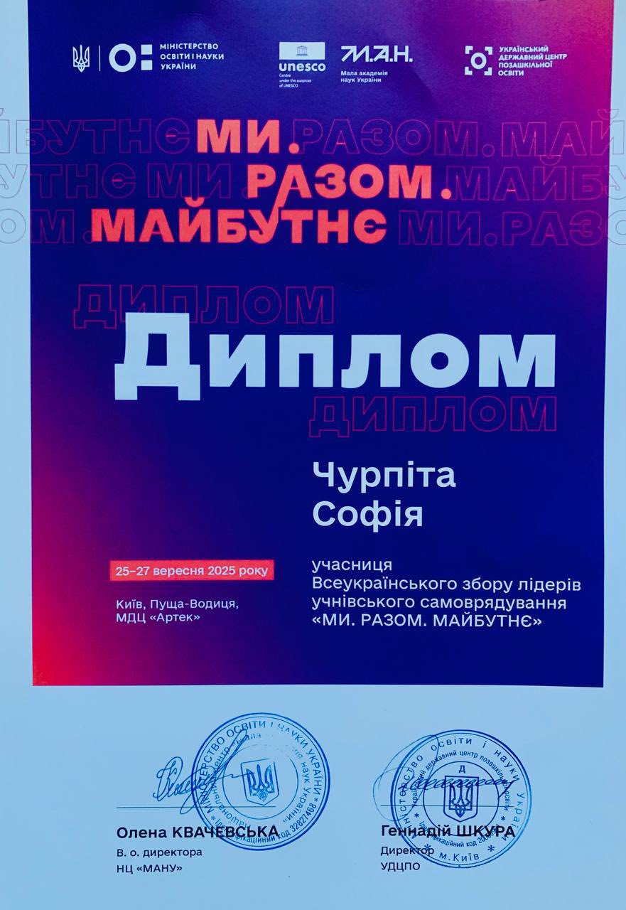 Наші лідери повернулися з Всеукраїнського збору лідерів учнівського самоврядування «МИ. РАЗОМ. МАЙБУТНЄ», який проходив в таборі МДЦ «Артек». Це були чудові дні знайомства та обміну досвідом, думками та планами з талановитими та цілеспрямованими лідерами з усіх куточків Украіни - від Харкова до Одеси. Всі працювали на тренінгах, вчилися організовувати заходи, зустрічалися з цікавими людьми. А ще було багато музики, танців та щирих емоцій. Як говорить Софія Чурпіта: «Попереду на нас чекають цікаві проекти, крутезні заходи, ідеї та втілення мрій. Ми, лідери, - ті, хто йде попереду і вірить в майбутнє. Лідер - ти, лідер - я; лідери уся сім'я!»