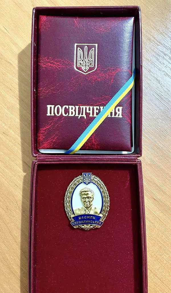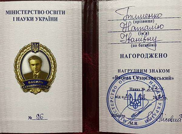 Від щирого серця вітаємо нашу дорогу Наталію Іванівну з нагородженням нагрудним знаком Василя Сухомлинського. Це високе визнання Вашого багаторічного сумлінного вкладу в освіту та виховання підростаючого покоління. Ваша праця, наповнена творчістю, високим професіоналізмом та відданістю дітям, є прикладом наслідування. Ця нагорода символізує Ваші особисті досягнення, як продовження справжньої педагогічної справи, що базується на гуманізмі та людяності, як вчив великий Василь Олександрович Сухомлинський. Бажаємо Вам міцного здоров'я, натхнення, нових педагогічних звершень та невичерпної енергії у Вашій творчій діяльності! Ваш педагогічний колектив.