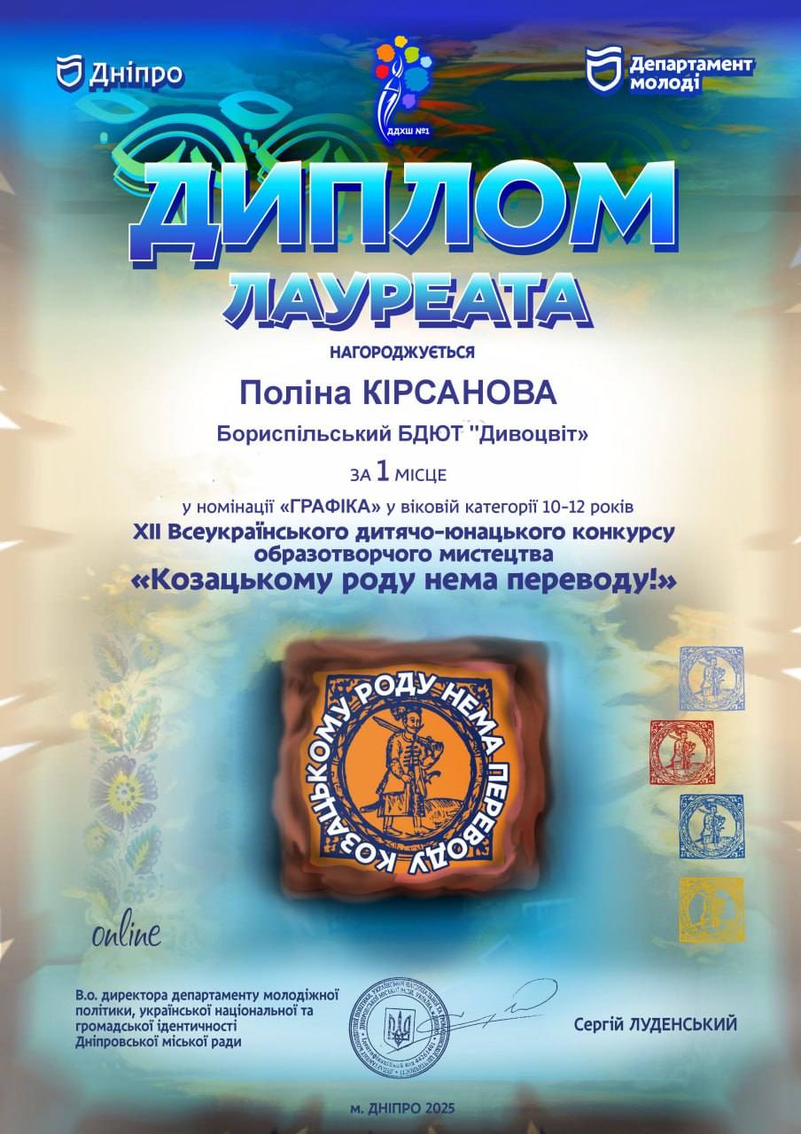 Із блискучими перемогами у ХІІ Всеукраїнському дитячо-юнацькому конкурсі образотворчого мистецтва “Козацькому роду нема переводу!” (м. Дніпро).