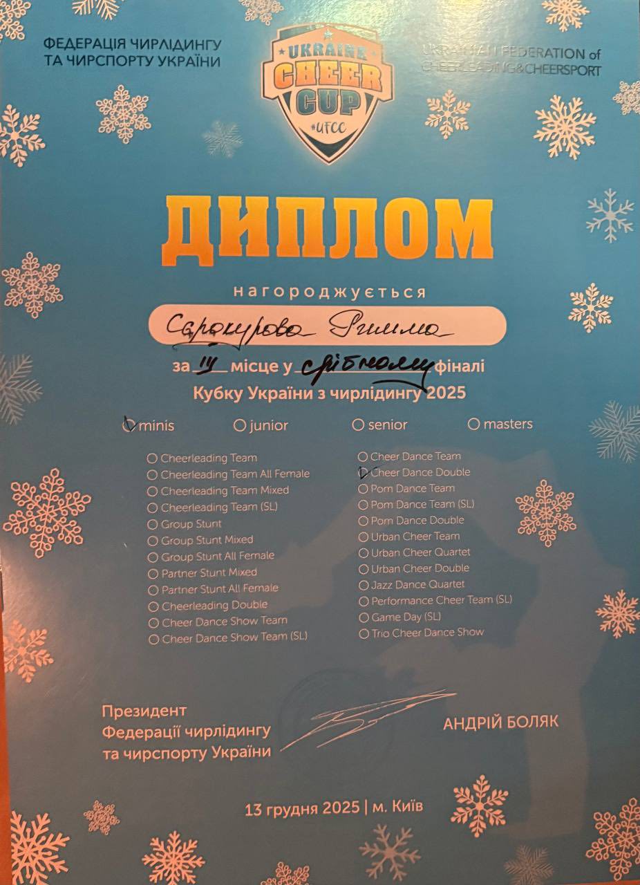 Вихованці клубу з чирлідингу "The best" (керівник Анна Проневич) стали переможцями у фіналі Кубку України з чирлідингу 2025! Вітаємо, пишаємось, так тримати!
