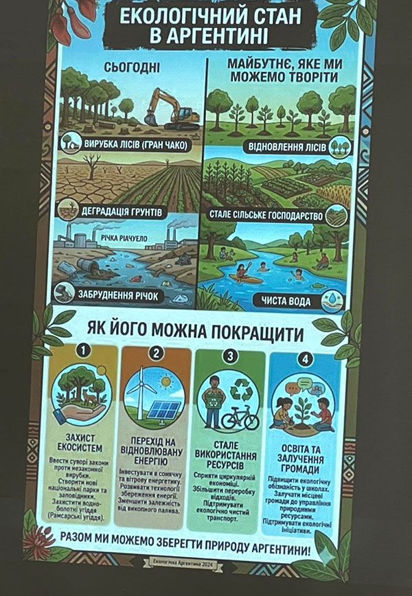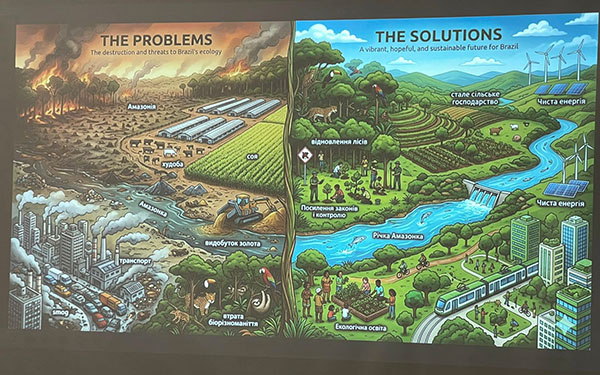 Особливу увагу приділили блоку «Еко-тайм», де учасники презентували власні плакати з креативними рішеннями екологічних проблем різних країн, демонструючи відповідальне лідерство та небайдужість до майбутнього планети.