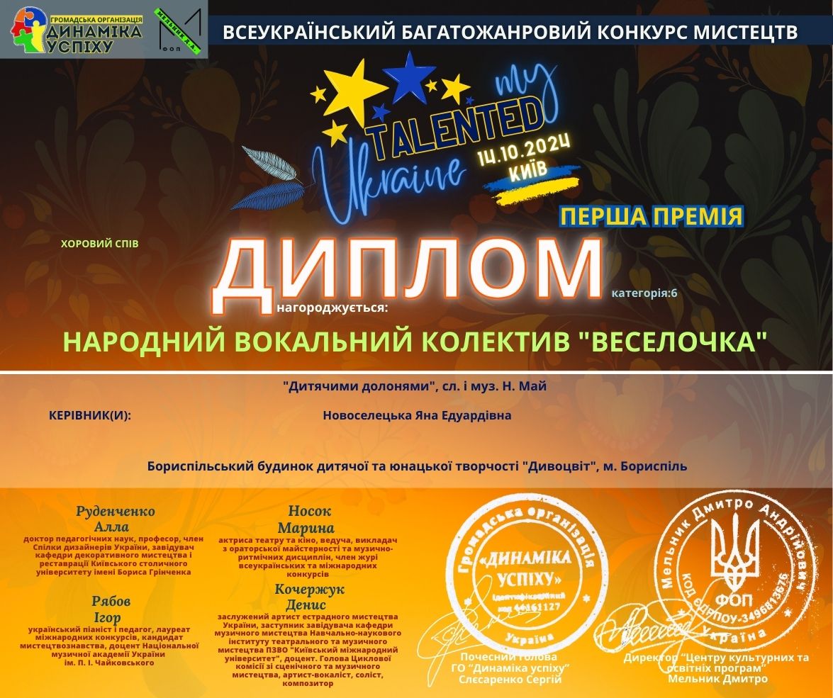 Вітаємо Народний вокальний колектив "Веселочка" та керівника Новоселецьку Яну Едуардівну з перемогами у всеукраїнському конкурсі мистецтв "My Talented Ukraine" і Міжнародному фестивалі-конкурсі мо... » Читати далі