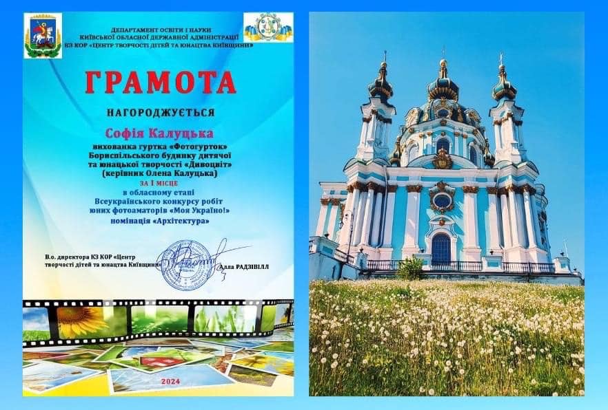 Вітаємо керівника фотогуртка Олену Калуцьку та її вихованку із зайнятим 1 місцем в обласному етапі Всеукраїнського конкурсу юних фотоаматорів «Моя Україна» 2024 (номінація - архітектура).