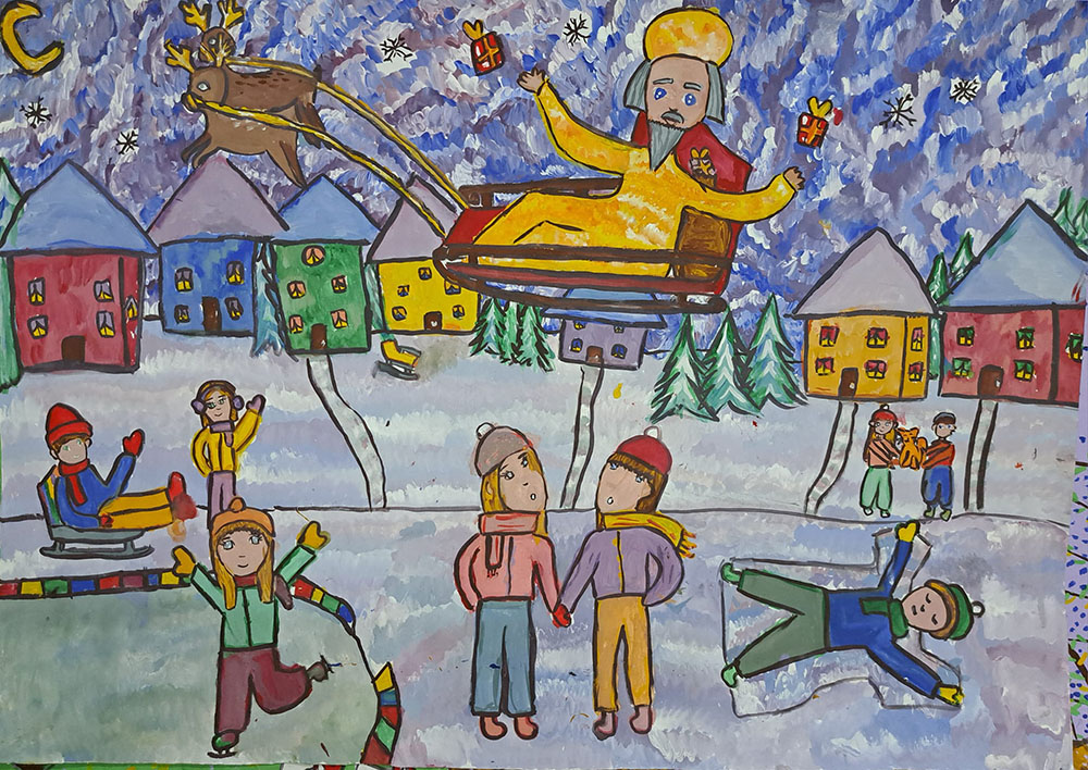 Блищать сніжинки на малятах,Іскриться сніг, біліє все.А з неба у святкових шатахНам Миколай дари несе.