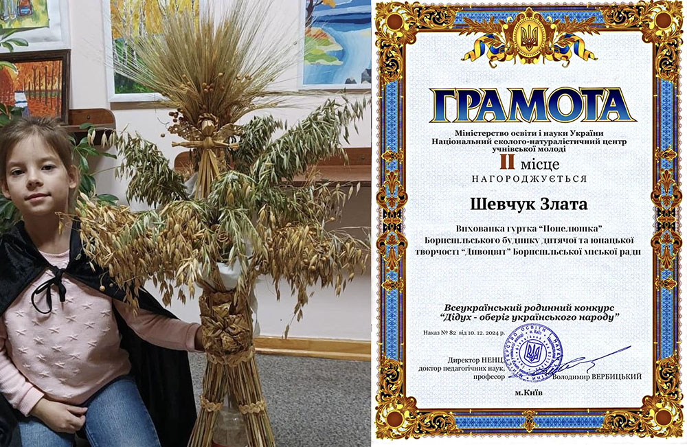 ШЕВЧУК ЗЛАТУ за зайняте 2 місце у Всеукраїнському родинному конкурсі «Дідух-оберіг українського народу». Гурток «Попелюшка». Керівник Лоскутова О. А.