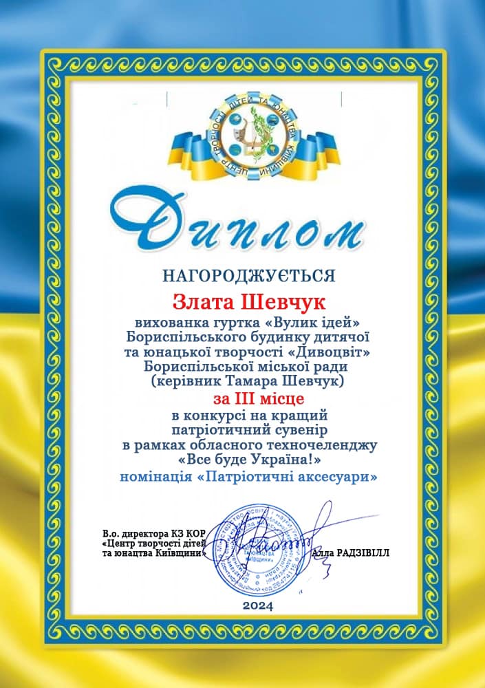 Шевчук Злату, вихованку гуртка "Вулик ідей" за зайняте ІІІ МІСЦЕ в конкурсі на кращий патріотичний сувенір в рамках обласного техночеленджу "Все буде Україна!" Номінація "Патріотичний сувенір". Ке... » Читати далі
