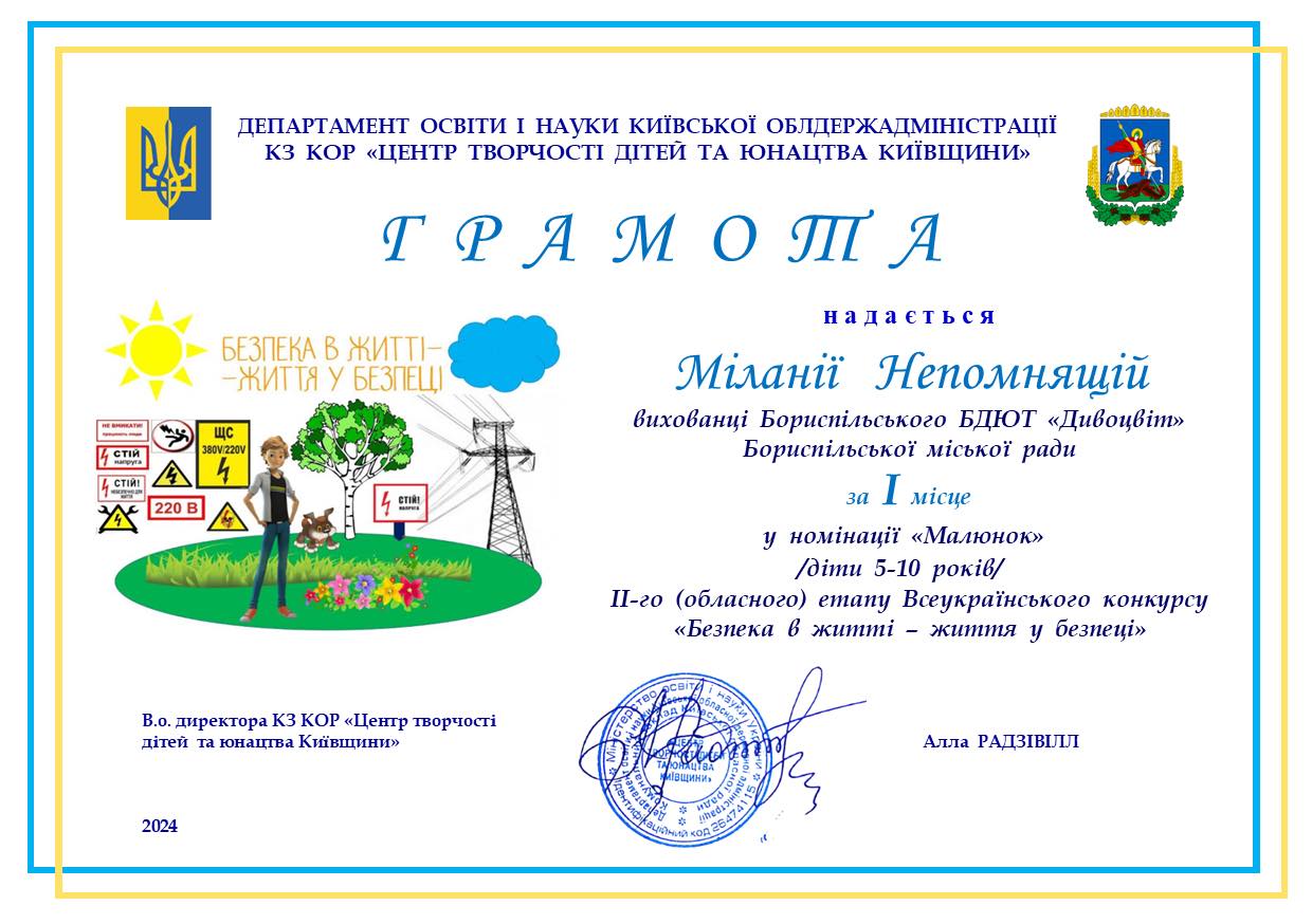 Міланію Непомнящу з перемогою: 1 місце у номінації «Малюнок» ІІ-го (обласного) етапу Всеукраїнського конкурсу «Безпека в житті - життя у безпеці», вихованку Зразкової студії образотворчої діяльнос... » Читати далі
