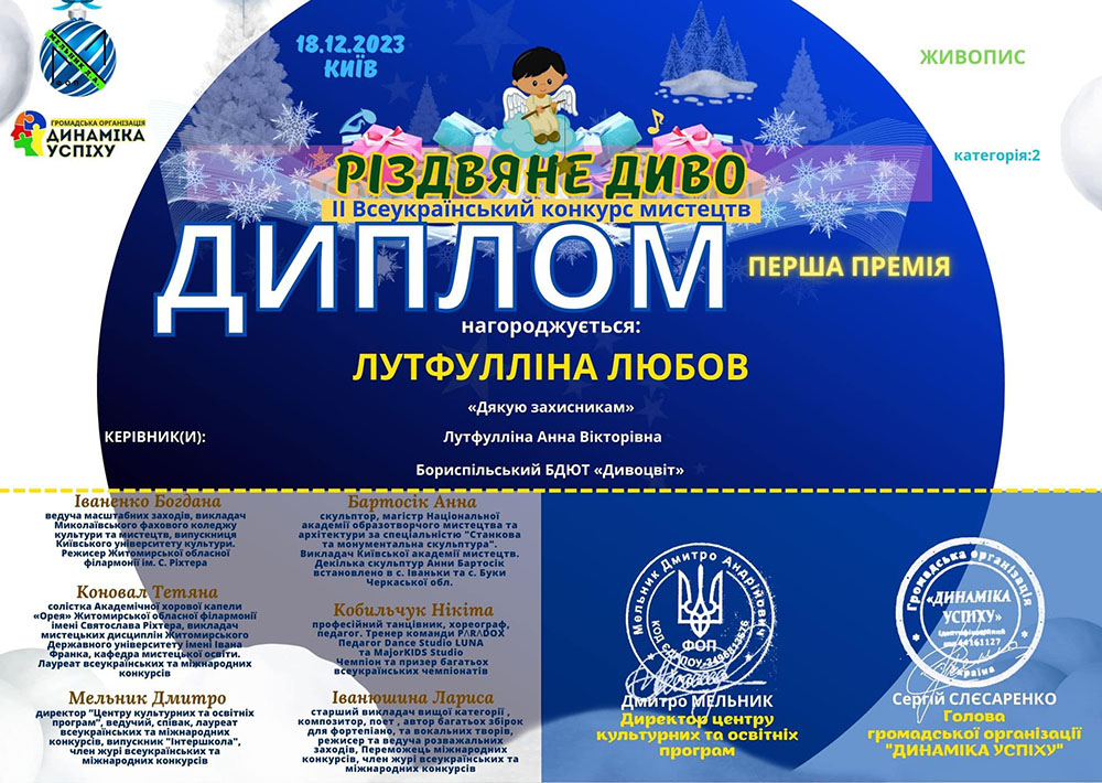 Вітаємо Лутфулліну Любов за отримання Першої премії в ІІ Всеукраїнському конкурсі мистецтв «Різдвяне диво» в номінації живопис.