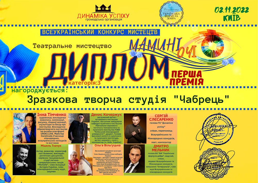 Вітаємо Зразкову творчу студію "Чабрець" з перемогою у Всеукраїнському конкурсі мистецтв "Мамині очі", Київ-2022.