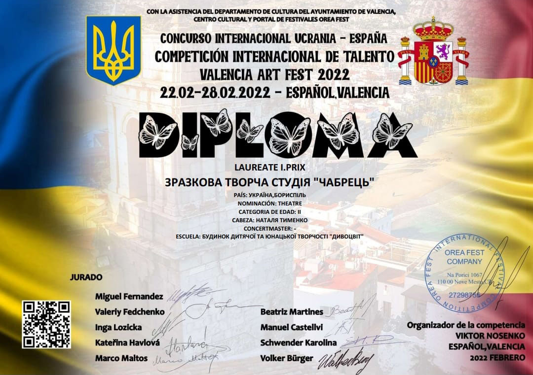 Вітаємо з перемогою Зразкову творчу студію "Чабрець" та керівника Наталію Тименко в Міжнародному конкурсi Valensia Art Fest - Spain. Середня та старша групи - дві вистави - перші місця.