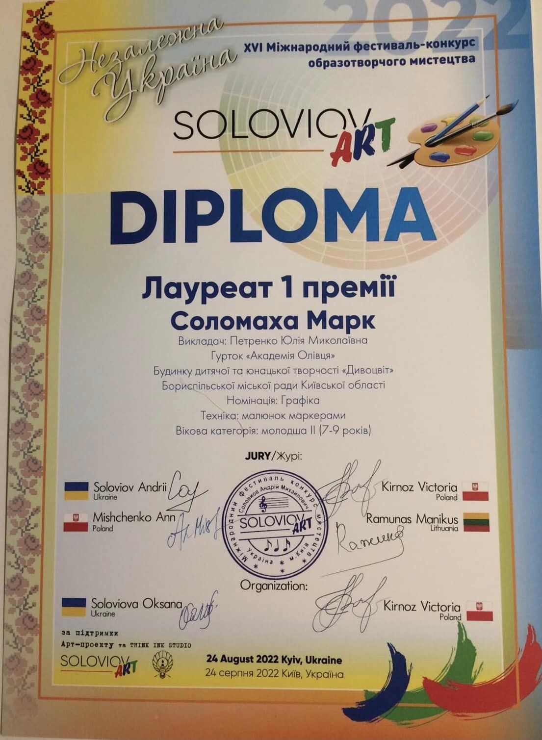 Соломаха Марк, вихованець гуртка «Академія олівця», керівник Петренко Ю.М., посів почесне 1-ше місце у Міжнародному фестивалі-конкурсі SILOVIOVArt. Його робота «Кобзар» буде експонуватися на виста... » Читати далі