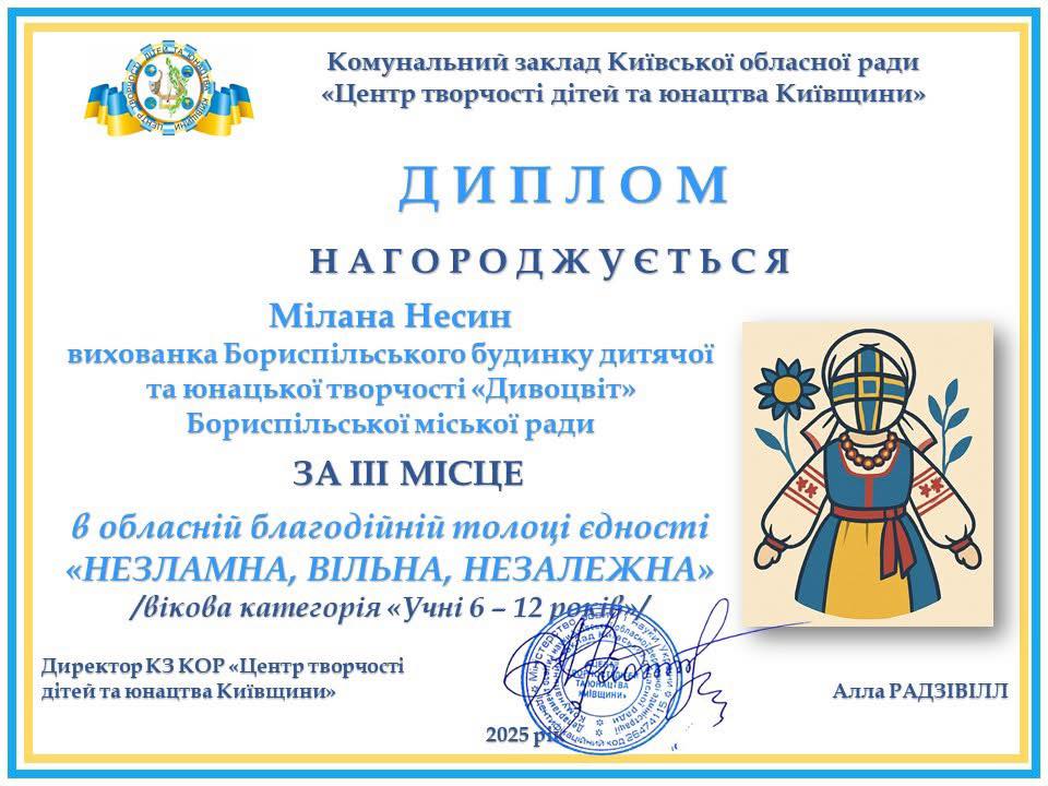 Вітаємо Несин Мілану за 3 місце в обласній благодійній толоці єдності «НЕЗЛАМНА, ВІЛЬНА, НЕЗАЛЕЖНА». Гурток «Оберіг». Керівник Олена Хайнюк.