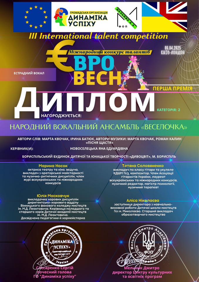 Вітаємо Народний вокальний колектив «Веселочка» з новими перемогами у Міжнародному конкурсі талантів «Євро весна»!