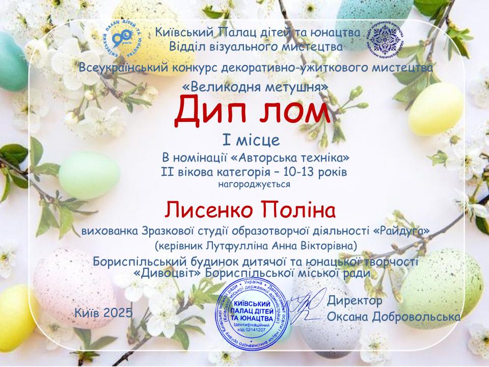 У всеукраїнському конкурсі декоративно-ужиткового мистецтва «Великодня метушня» вихованців зразкової студії образотворчої діяльності «Райдуга»: