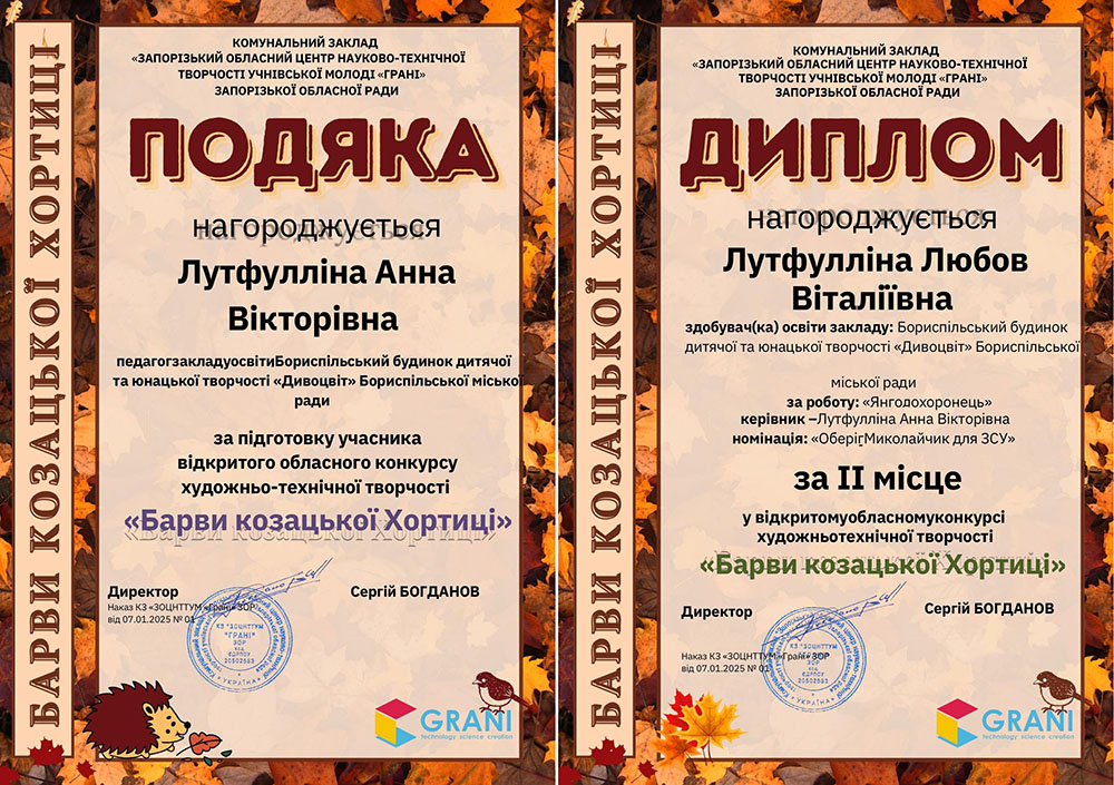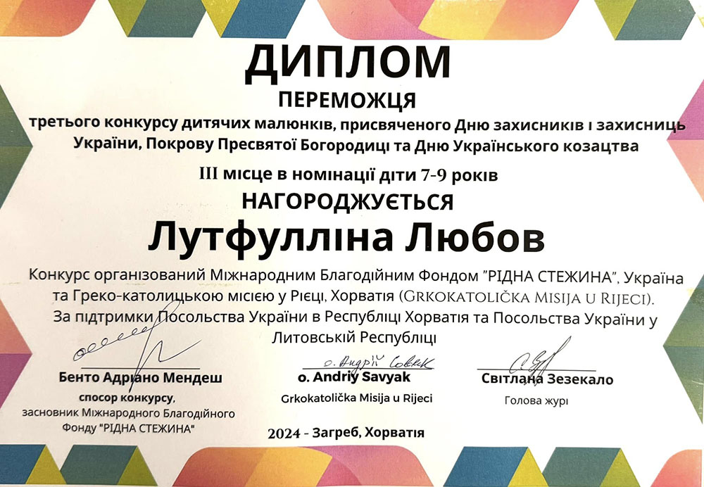 Лутфулліну Любов за зайняте 3 місце у ІІІ Міжнародному конкурсі дитячих малюнків, присвяченого Дню захисників і захисниць України, Покрову Богородиці та Дню Українського козацтва. Дякуємо ... » Читати далі