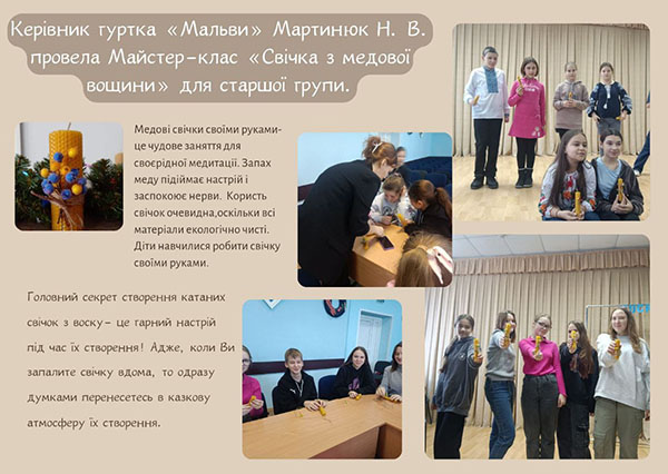 На гуртку "Чарівний пензлик", керівник Валентина Вергун, пройшов майстер-клас з виготовлення оберегів для наших захисників. Нехай дитяча творчість дарує тепло, підтримку, та силу духу кожному нашому воїну! З вірою в серці, з вірою в перемогу. Також відбувся майстер-клас "Свічка з медової вощини" від керівника гуртка "Мальви" Наталії Мартинюк.